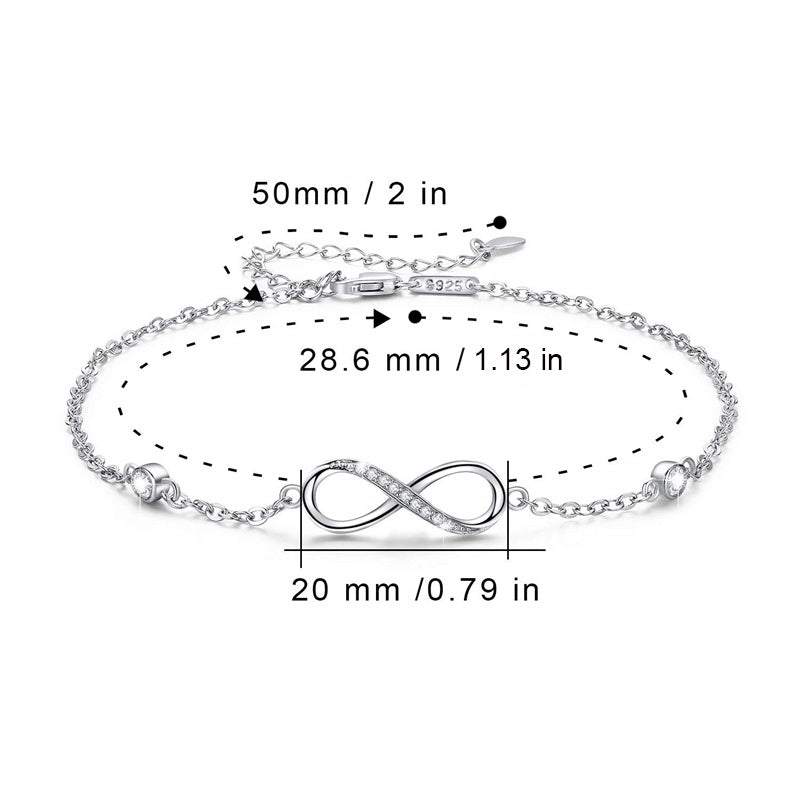 This glittering sterling silver infinity anklet looks like a lying eight number represents everlasting love and friendship, the infinite and endless encircles the ankle on a shimmering chain, fastened with a sterling silver lobster clasp; this adjustable bracelet is punctuated by a beautiful infinity symbol, embellished with glittering white cubic zirconia to make it more eye-catching.