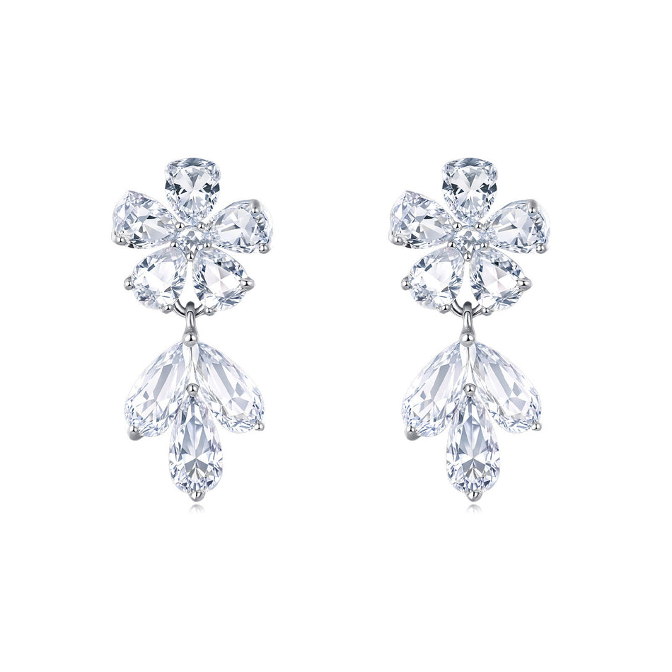 These exquisite earrings showcase a mesmerizing floral design, featuring five radiant round zircons forming a blossoming flower atop each earring. Below the central bloom, three elongated teardrop-shaped zircons cascade downward, creating a dynamic sense of movement and luxury. Crafted with precision, the intricate setting enhances the gemstones' brilliance, while the symmetrical arrangement exudes timeless elegance. Perfect for formal events or special occasions, these earrings combine classic sophistication with modern artistry, making them a statement piece for those who appreciate refined jewelry. The interplay of light across the facets delivers a dazzling effect, ensuring they remain the focal point of any ensemble. Whether worn for weddings, galas, or romantic evenings, these earrings embody opulence and grace, elevating every outfit with their sophisticated charm.