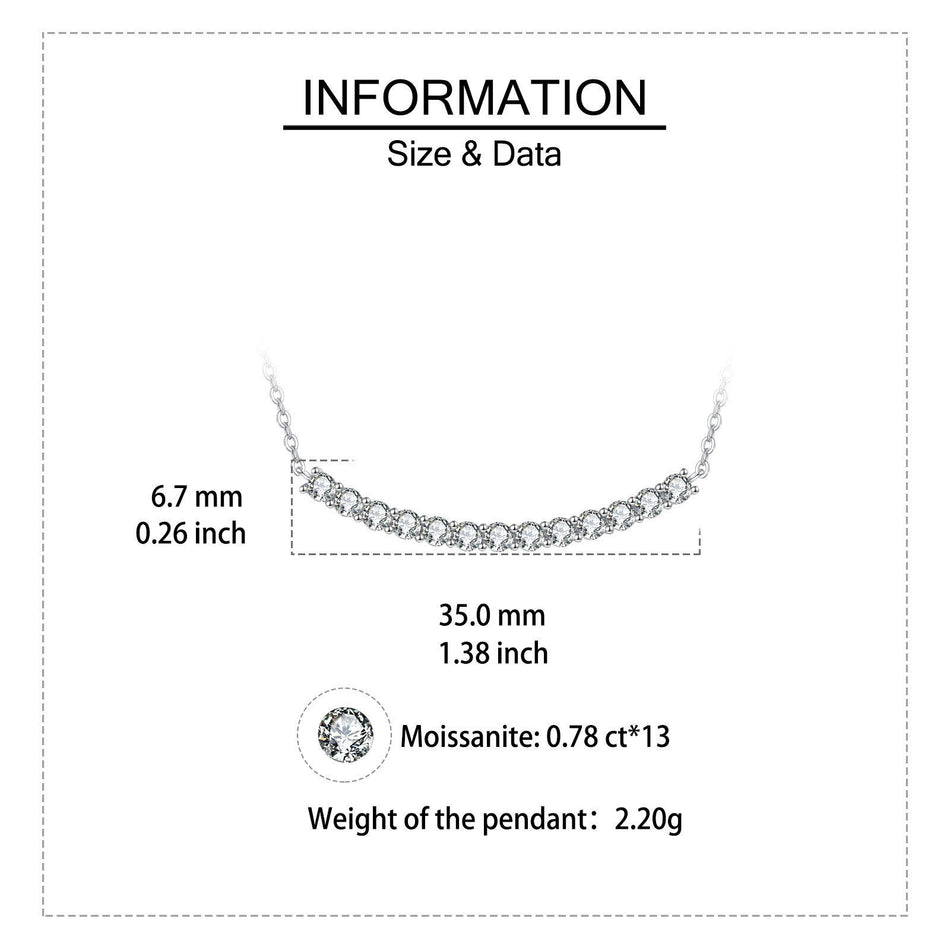 This exquisite necklace features a delicate sterling silver chain adorned with a gracefully curved bar pendant set with 14 round-cut Moissanites. Each stone is meticulously claw-set, showcasing exceptional brilliance and fire against the polished metal. The symmetrical arrangement creates a harmonious arc, exuding timeless sophistication. Designed for versatility, the lightweight piece transitions seamlessly from casual outings to formal gatherings. The high-quality craftsmanship ensures durability while maintaining a luxurious aesthetic. A perfect choice for those who appreciate subtle elegance combined with enduring style. Whether worn alone or layered, this necklace adds a touch of refined glamour to any ensemble. Its minimalist yet striking design makes it an ideal gift for celebrations or a cherished addition to personal jewelry collections. Crafted with precision, every detail—from the secure clasp to the flawless Moissanite cuts—reflects commitment to quality. Elevate your look with this classic piece that balances modernity and tradition.