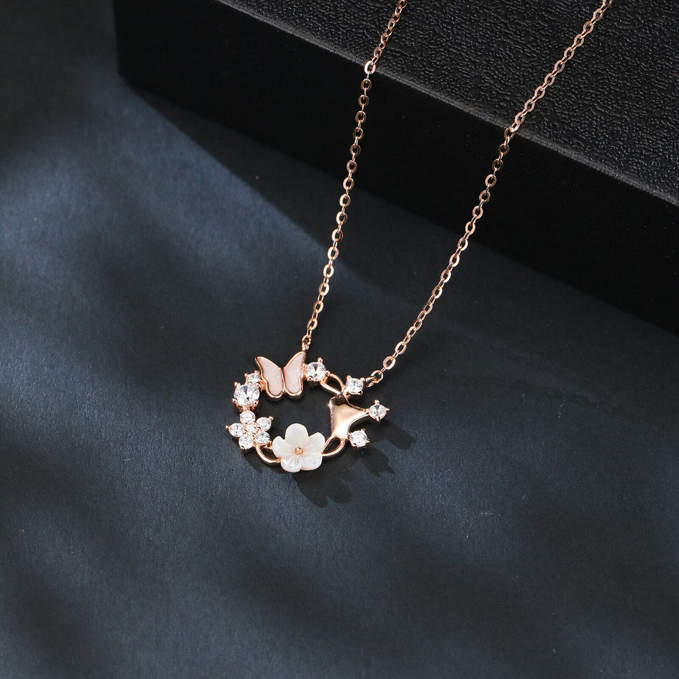 This exquisite necklace features a delicate rose gold chain adorned with an intricate pendant combining nature-inspired elements. The design showcases a graceful butterfly with translucent white wings, accompanied by blooming flowers crafted from pearlescent material. Sparkling clear gemstones accentuate the curves of the butterfly and petals, adding a touch of brilliance. The seamless integration of metallic elegance and natural motifs creates a harmonious balance, making it perfect for both casual and formal wear. Crafted with precision, this piece exudes sophistication and charm, ideal for those who appreciate artistic jewelry with a feminine touch. Its lightweight yet durable construction ensures comfort, while the adjustable chain length enhances versatility. Whether gifted or self-purchased, this necklace symbolizes beauty, transformation, and timeless style, capturing the essence of delicate artistry in everyday adornment.