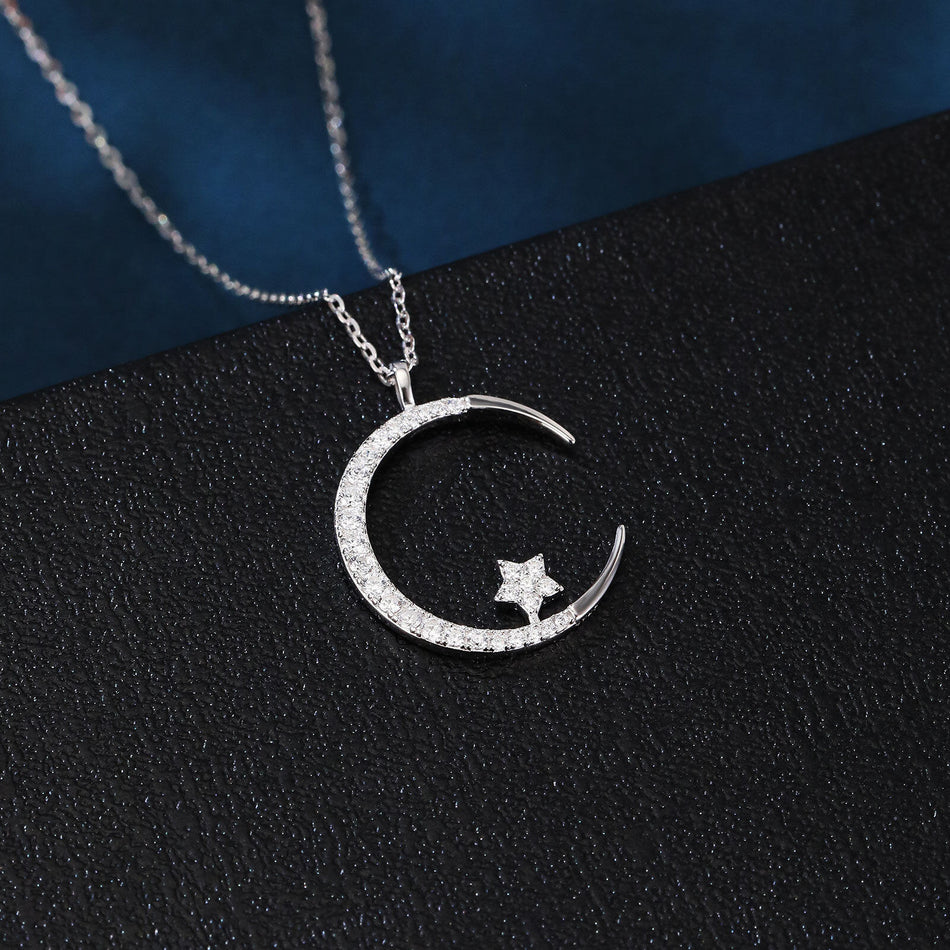 925 Sterling Silver Elegant Silver Crescent Moon & Star Zircon Pendant Necklace