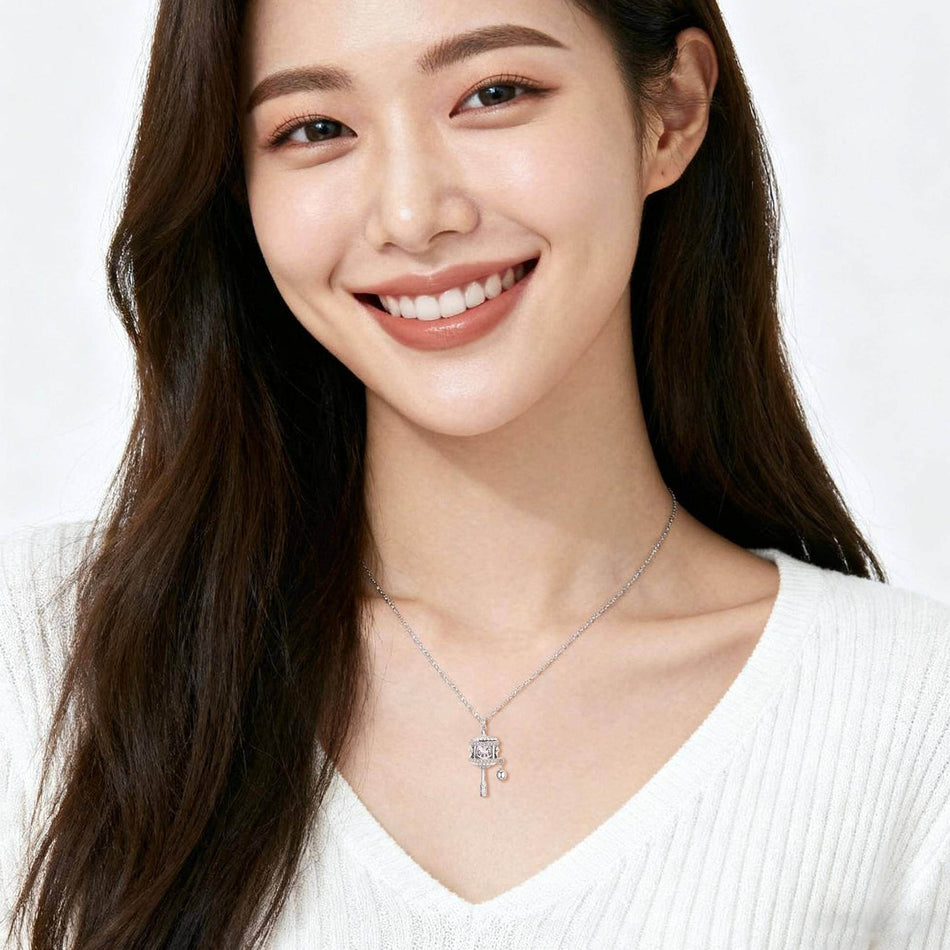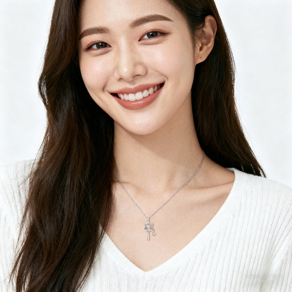 This exquisite sterling silver carousel pendant necklace captures whimsical charm with its intricately designed rotating horse figures encased in a cylindrical frame. Adorned with sparkling crystal accents along the arched roof and scalloped base, the pendant exudes elegance. A delicate filigree-patterned pole connects to a polished spherical charm, adding playful movement. The fine chain complements the pendant’s sophisticated yet playful aesthetic, making it a timeless accessory for any occasion.