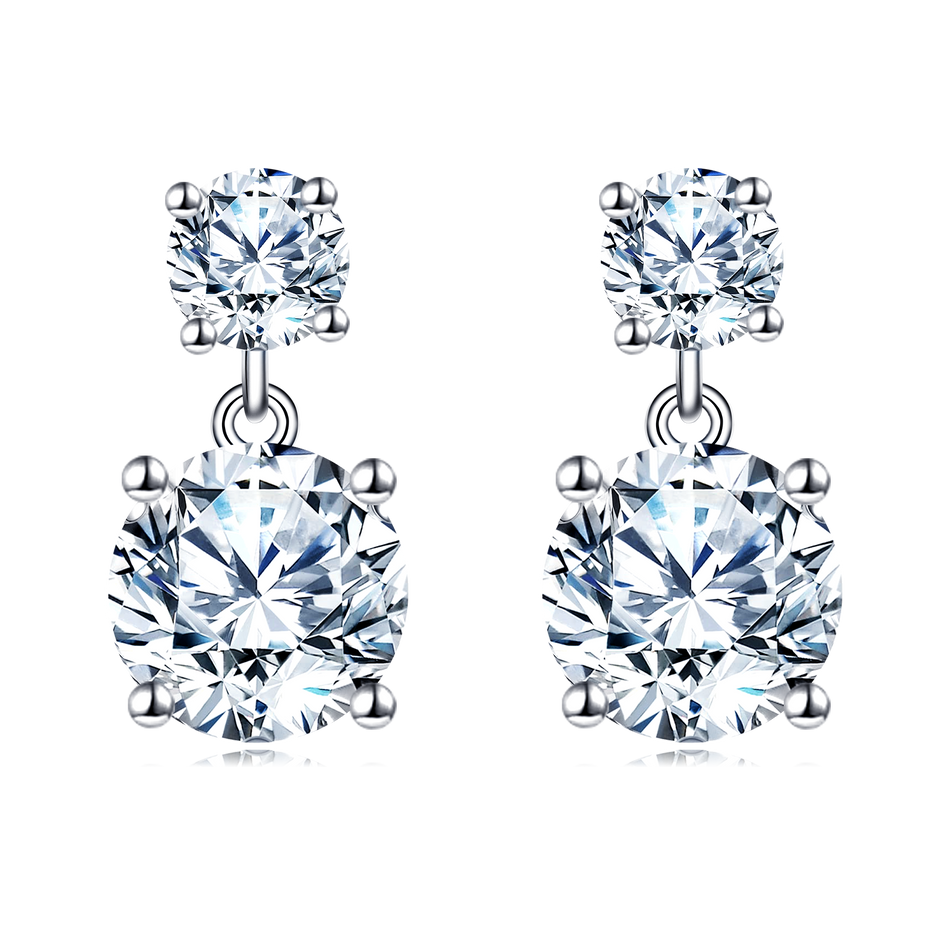 These exquisite silver earrings feature a sophisticated double-Moissanite design, combining a smaller round-cut stone at the top with a larger, brilliantly faceted Moissanite below. Crafted with precision, each gemstone is securely held by a classic four-prong setting, enhancing their sparkle and durability. The high-polish metalwork adds a luxurious touch, while the sleek drop style offers versatile elegance. Perfect for formal events or everyday wear, these earrings exude timeless charm and make a stunning statement. Ideal for those who appreciate refined jewelry, they promise enduring beauty and sophistication.