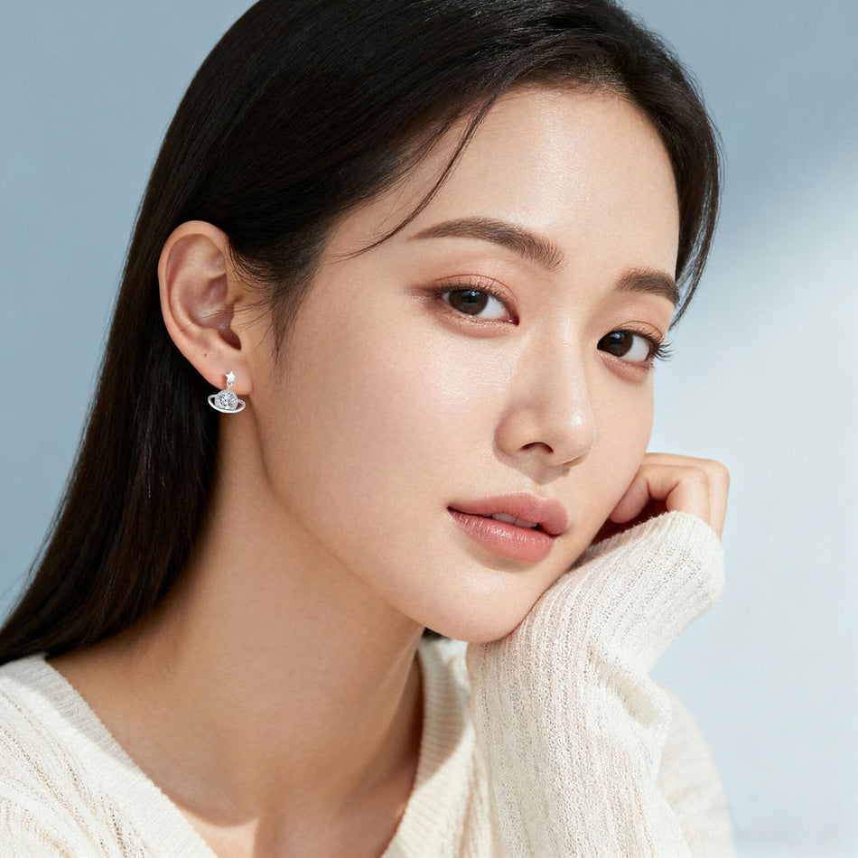 These exquisite earrings feature a delicate star charm suspended above a luminous round Moissanite, encircled by a shimmering halo of smaller gemstones. Crafted in polished silver, the design combines celestial inspiration with timeless elegance. The asymmetrical drop style adds movement, while the pristine white backdrop accentuates the jewels’ brilliance.Shown from multiple angles, the craftsmanship highlights intricate details, making them perfect for special occasions or everyday sophistication. A harmonious blend of modern flair and classic luxury, these earrings elevate any ensemble with their sparkling allure.