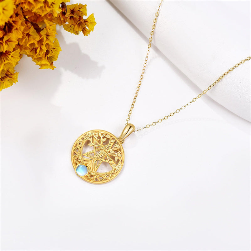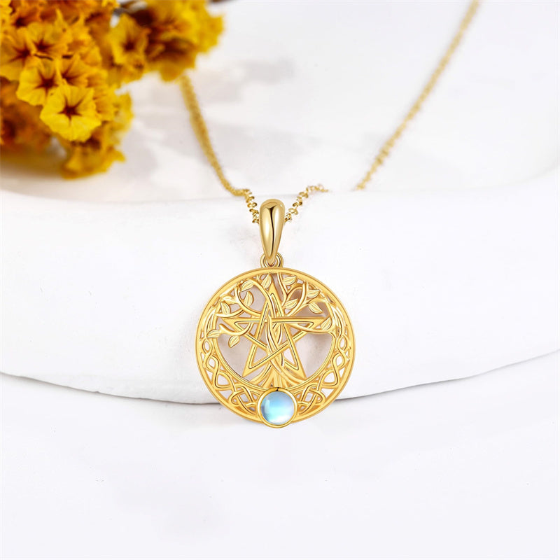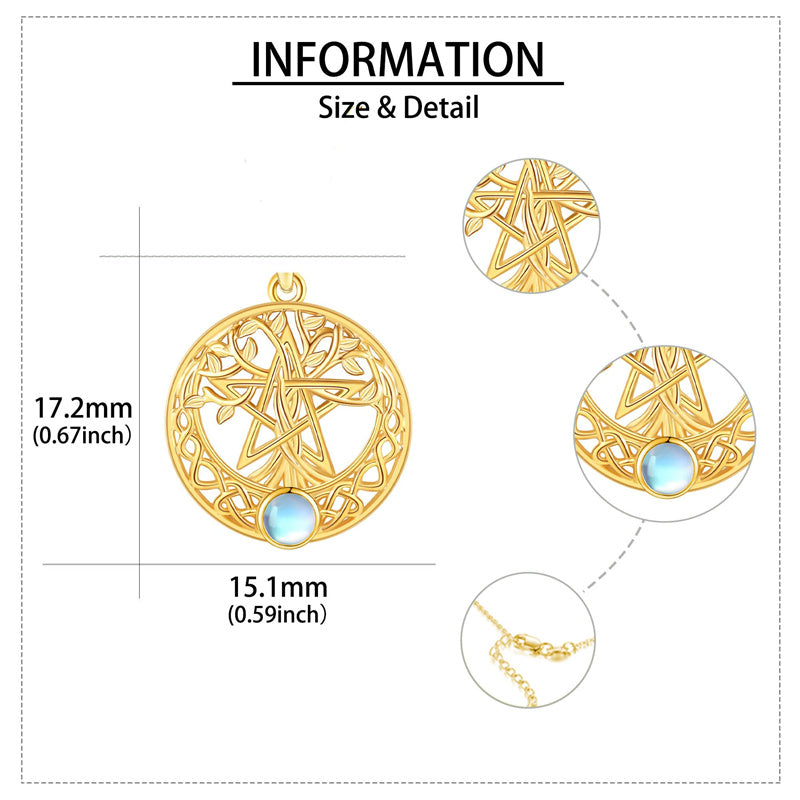 The Pentagram Tree Necklace symbolizes the harmony between nature and spirituality. It combines the pentagram, Celtic moon, and Tree of Life to represent balance, interconnectedness, and the beauty of ancient Celtic traditions.