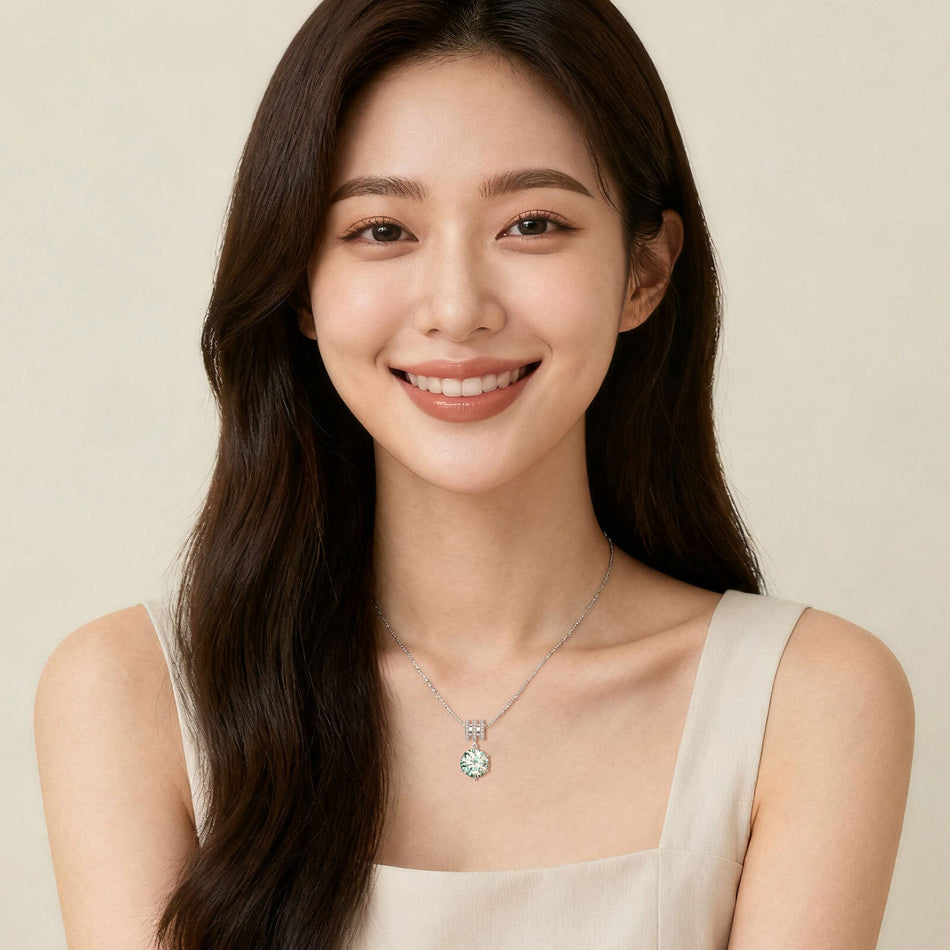This exquisite necklace features a striking square pendant showcasing a radiant teal Moissanite as its centerpiece, meticulously cut to enhance brilliance and depth. The gemstone is elegantly framed by four vertical rows of smaller, precision-set clear Moissanites along the chain, creating a harmonious blend of color and sparkle. Crafted in sleek silver-tone metal, the design exudes modern sophistication while maintaining timeless appeal. The adjustable chain allows versatility for layering or solo wear, making it perfect for formal events, casual outings, or special celebrations. The teal Moissanite’s unique hue adds a touch of rarity and personality, distinguishing this piece from traditional jewelry. Whether gifted or self-purchased, this necklace symbolizes luxury, confidence, and artistic expression, promising to become a cherished accessory for any wardrobe. Its balanced proportions and high-quality craftsmanship ensure durability and lasting beauty, capturing attention with every movement.